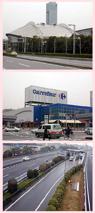E幕張メッセ(美浜区) 言わずと知れたイベントゾーン、このドームの右側もすべて「幕張メッセ」の建物です。国際会議場・国際展示場・コンサートホールなどがあり、「東京モーターショウ」や「ゲームショウ」をはじめ他にも様々なイベントが年中行なわれています。この日は「フラワーショウ」が開催されていました。 |