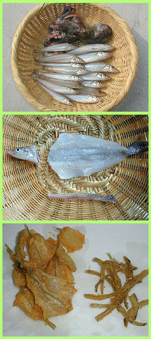 | てんぷら完成、(ちょっと揚げすぎか?でも、OK!OK!)熱いうちに塩でいただくと最高!中骨は干して乾燥させてからそのまま揚げて「骨せんべい」にする。(これがなかなか香ばしくてイケます!これも塩、日本酒があいそう!)だけど飲めないa-hirota・・・・ | |