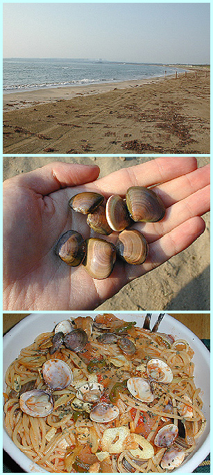 | 採れる!採れる!波うち際の深さ10cmの砂の中にご覧のような貝がたくさんおりました。6月なのでまだ水が冷たいですが1時間半ほど海に入り約50個のアサリが採れました! | |