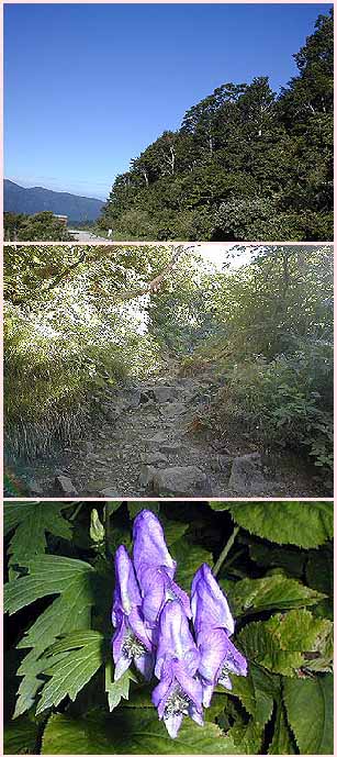 | ハクサントリカブト トリカブト類のほとんどは花が青紫で烏帽子形です。白山の高山植物を代表するハクサントリカブトは高山から亜高山に生息し砂防新道のいたる所で観察できます。 |
