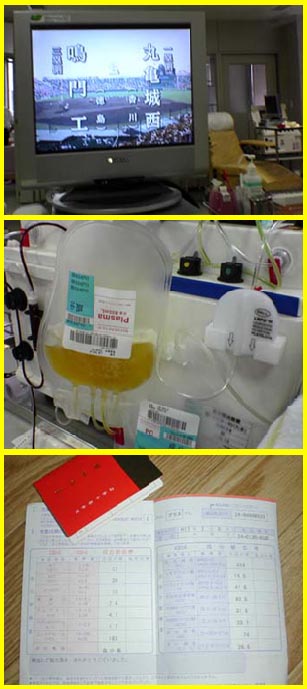 | 今月は献血に行ってきました。きっかけは特にありません。たまたま血液センターの前をクルマで通り立ち寄ってみました。・・・献血には血液の成分を分離することなくそのまま献血する「全血献血(200ml・400ml)」と血液の成分のうち特定の成分だけを献血する「成分献血」があります。今回は成分献血をすることにしました。 |