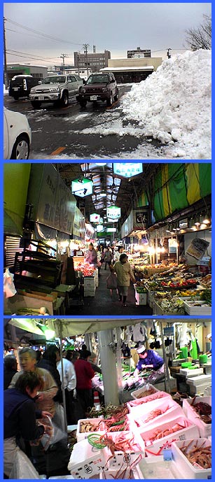 | 雪の中、金沢市民の台所「近江町市場」へ行ってきました。「近江町市場」は鮮魚をはじめ肉や野菜などの食材店の他に飲食店や衣料店などの170もの店舗がひしめく市場です。ココはアーケード街なので雨・雪・風が凌げます。 | |