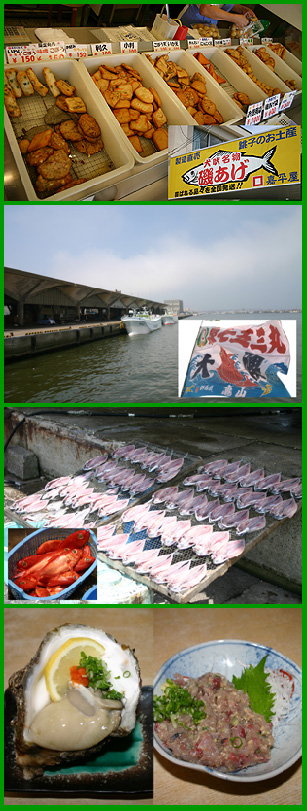 | 銚子港のすぐ脇にある海鮮風居酒屋で昼食です!朝に獲れたばかりの海の幸、大きな「岩牡蠣」と房総の漁師料理「アジなめろう」を冷酒と一緒にいただく贅沢なひと時!もちろん焼き魚や刺身も豊富で新鮮です。 | |