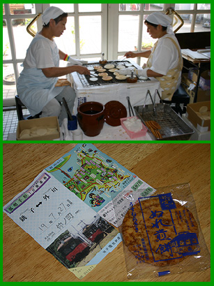 再び銚電に乗って犬吠駅へ・・・改札の脇で銚電職員のおばちゃんがお煎餅を焼いています。銚電の大切な副業そのA、コレが銚電を救った噂のお煎餅です!焼き上がったばかりの香ばしいお煎餅を食べるも良し!醤油に浸して「ぬれ煎餅」を食べるも良し! |