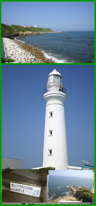 | 犬吠埼灯台 入場料:150円 犬吠駅から徒歩10分、犬吠埼灯台に着きました。白色のレンガ造りのこの灯台は1874年(明治7年)にイギリス人の設計で建てられた高さ31.57mの高塔です。 目が回りそうな99段のらせん階段を登ると、そこには雄大な太平洋とまぁ〜るい地球の眺望が!(頑張って登る甲斐あり!それにしてもイイ天気だ♪) |