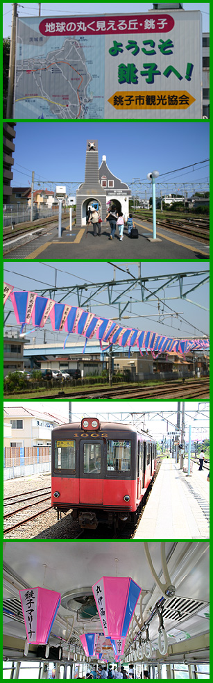 | 銚子市へは実家(千葉市)から東へ約60km、JR総武本線の普通列車で約2時間で到着します。銚子駅から更に「銚電」に乗り換え各駅を巡ります。 |