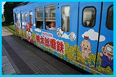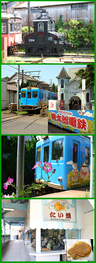 | 観音駅に到着しました。このカラフルな車両は「桃太郎電鉄20周年記念」のラッピング電車です!房総の花「菜の花」をバックに「桃鉄」おなじみのキャラクター、桃太郎・夜叉姫、キングボンビーなどが描かれています。 | |