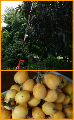 夏の収穫の一部です。高枝切ばさみで採っているのはビワです。今年のビワは美味い!実は大昔、小学生だった自分がこっそり植えた疑いがあるビワの種(まったく記憶に無いがオフクロがそう言ってます。)が大きく育ち今ではとんでもない高さに!夏になるとビワが鈴なりです!去年までは淡白な味でイヤイヤ食べていたこのビワですが、今年は好天続きのためか甘味が増しています。庭のビワがこんなに美味しい年ははじめてです。