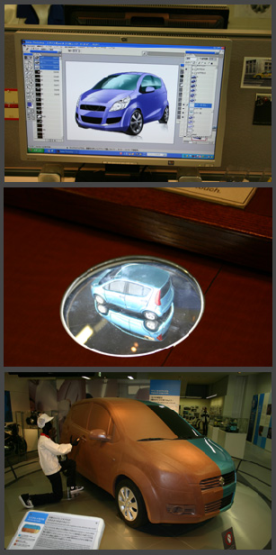 コンセプトに応じて立案されたものをCGでイメージし、実物大のクレイモデル(粘土細工)で曲線を忠実に造形してゆきます。実際に使用される色に塗られ、光の反射や色の映り具合をチェックします。