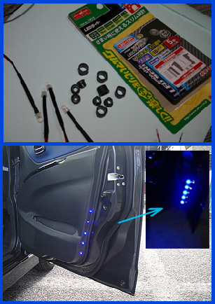 さらに青色LED DIYでは欠かせないお馴染み「エーモン工業」のLEDグッズを使って、ドアの内張りにウェルカムランプやイルミを兼ねたLEDライトを取り付けました。 左右共に内張り側面にドリルで穴を開け、なるべく純正っぽさを崩さないように同色グレーのマウントを5個ずつ埋め込みました。ドアの開閉に連動するように配線してあります。夜になると乗り降りの際に足元を照らします。 |