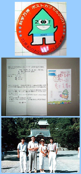 「科学万博ポストカプセル2001」の配達 〜21世紀のあなたに届ける夢の郵便〜 ポストカプセルには全国から約326万通にも及ぶ手紙が投函されました。その中の1通がこの手紙です! 〜手紙の内容〜 手紙のあて先をまちがえてしまい、つくのが16年ほど遅くなりました。本当にすみません! 1985.(S60)8.31(土) PM.3:02 天気:晴れ(台風の次の日)風強し 気温:30℃ −1985.8.31− 広田 亮 14才 中3 身長:170ぐらい 体重:47.5kg みなさんお元気ですか、16年前のぼくは元気です。この夏休みぼくは鎌倉へ行きましたので、その時の写真をお送りします。みなさんは今何をしてすごしていますか?きっと今とはちがい技術の進歩で今では難しいことが簡単に素早く、しかも正確に行う機械やコンピュータを持ち何かしているのでしょうか? ゲームも今とはちがい、ファミリーコンピューターなどではなくて、もっとすごいゲームではないですか?旅行も海外ではなく宇宙へ行く時代になっているのでは?その他、変わったことがあったらおしえて下さい。お手紙おまちしています。ではお元気でさようなら。 20〜21へ |